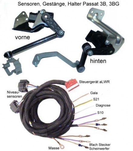 Retrofit kit for adding auto-leveling sensors to HID/Xenon headlights to VW Passat 3BG.