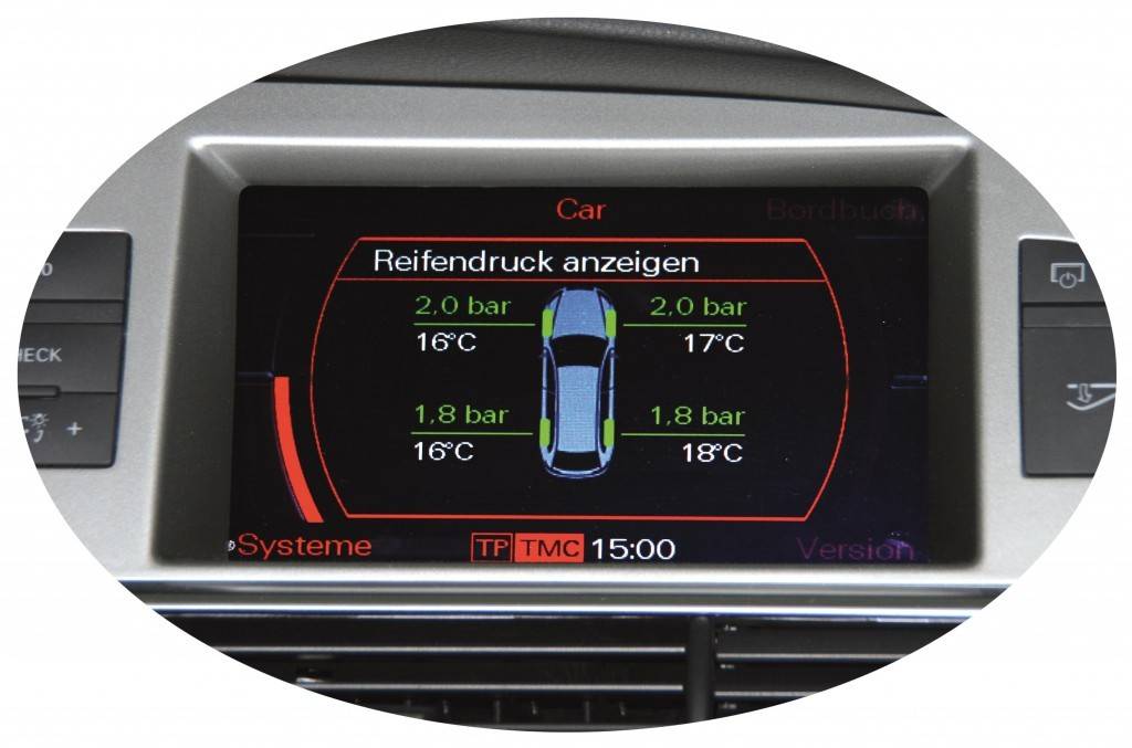 - Weergave van de druk en de temperatuur van elk wiel door MMI-scherm.